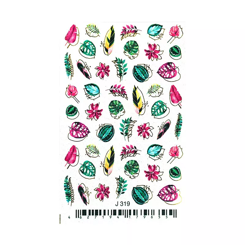Vizes körömmatrica trendi, trópusi levelekkel, arany hatással.