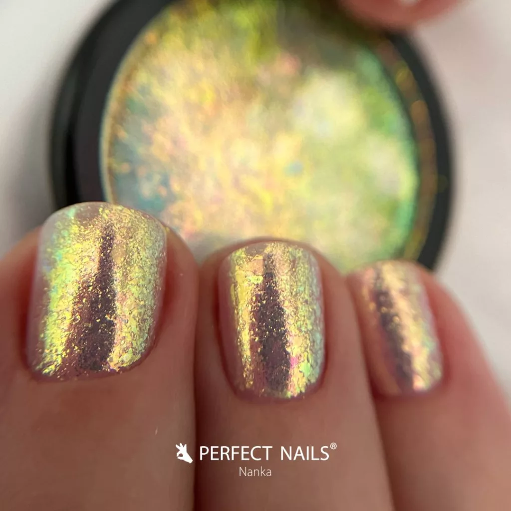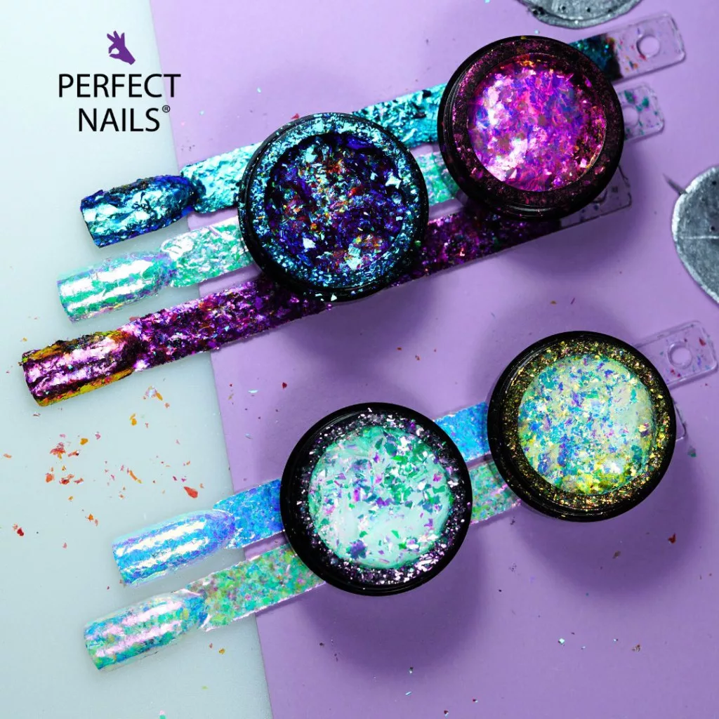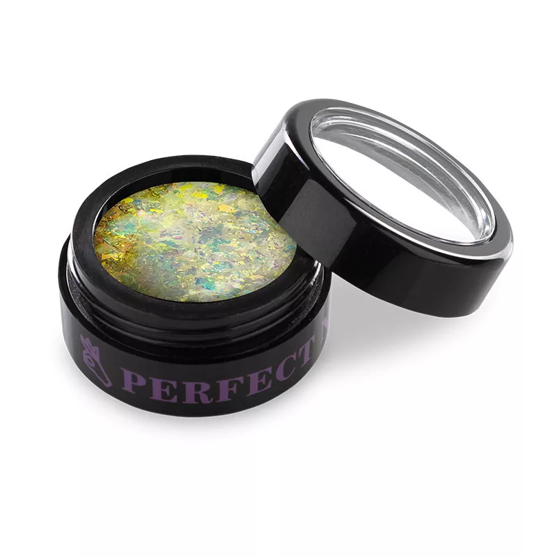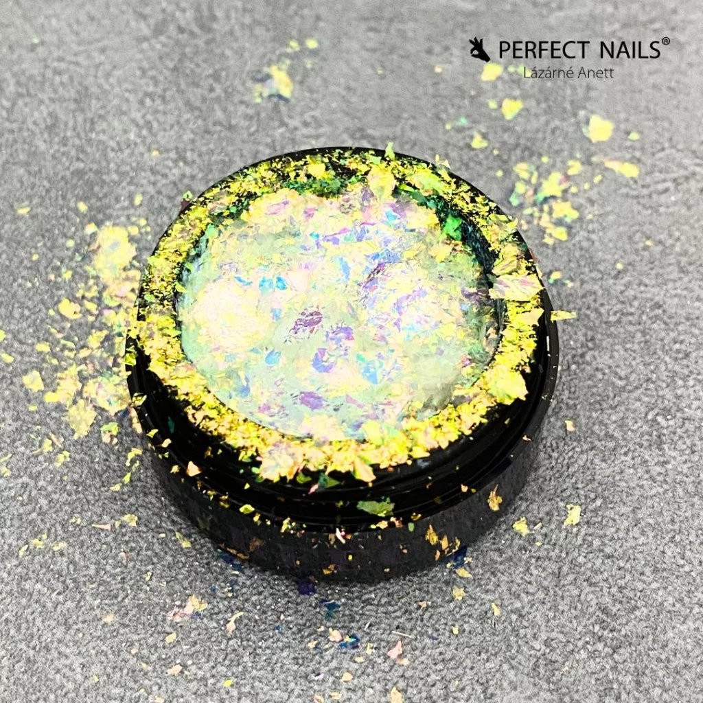- Glue Gelt vagy híg ecsetes építő zselét (pl. ELastic Hard) felviszünk a felületre, majd belenyomkodjuk a pelyheket, köttetés után rugalmas (pl. Cool Shine Ever) fényzselével fedjük.