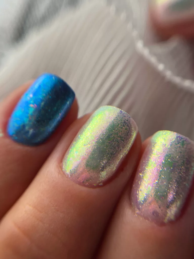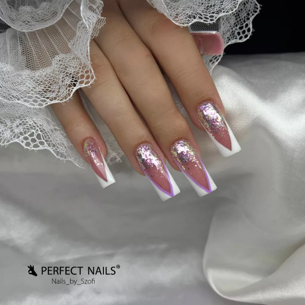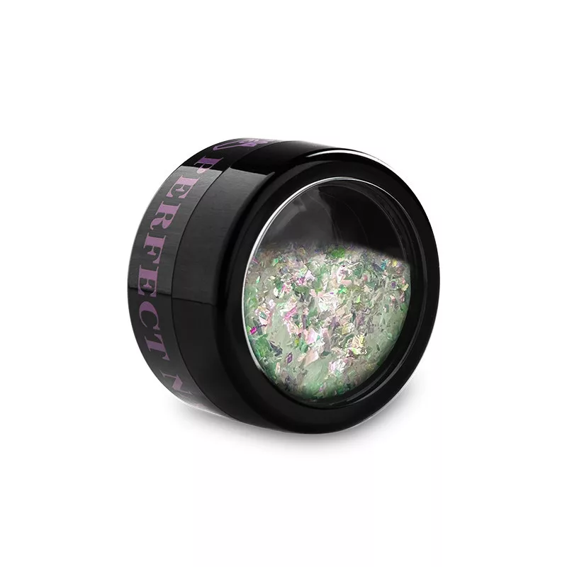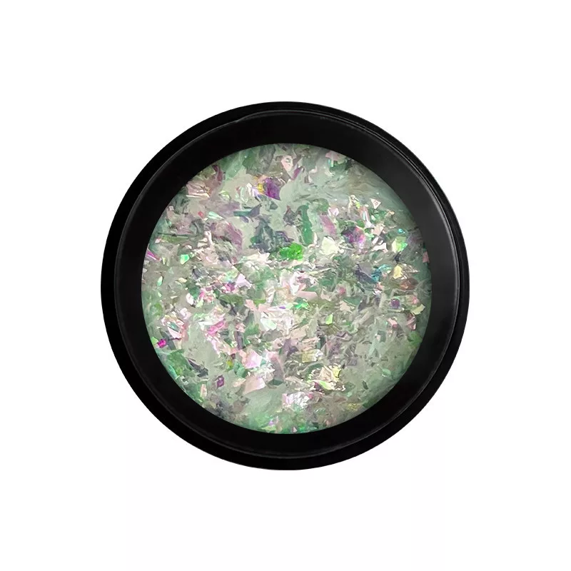 - Glue Gelt vagy híg ecsetes építő zselét (pl. ELastic Hard) felviszünk a felületre, majd belenyomkodjuk a pelyheket, köttetés után rugalmas (pl. Cool Shine Ever) fényzselével fedjük.