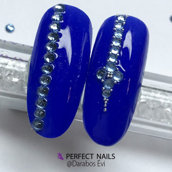 Az elkészült köröm felületét mattítsuk be, majd Glue Gel segítségével helyezzük fel a köveket a köröm felületére. 5-10 másodperc köttetés után fedő fénnyel zárjuk a körmöket a kövek körül is. A szebb hatás érdekében a kövekre ne tegyünk fedőfényt.