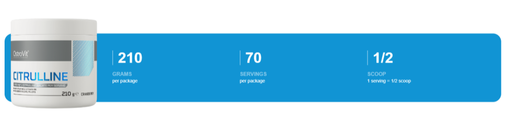 Az OstroVit Citrulline egy kiváló minőségű étrend-kiegészítő, amely citrullin-malátot, valamint taurin és B6-vitamint tartalmaz. Finom áfonya ízű, kényelmes por formában elérhető, és nem tartalmaz hozzáadott cukrot. A terméket sportolóknak és fizikailag aktív embereknek fejlesztették ki, akik értékes összetevőkkel szeretnék kiegészíteni étrendjüket.