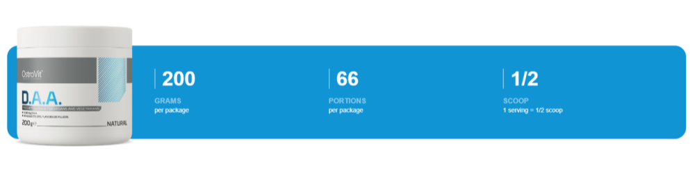 - D-aszparaginsav forrása – Egy adag étrend-kiegészítő 3 g D.A.A.-t biztosít a szervezetnek.