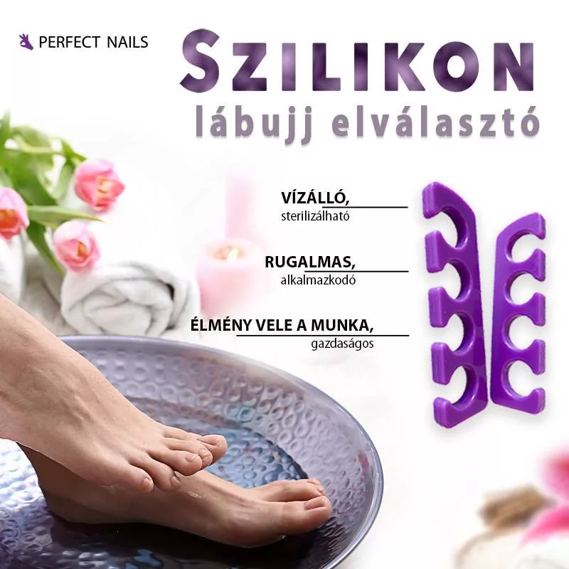 Lakkozásnál, körömsarok kezelésénél kíméletesen tartja távol a lábujjakat egymástól. Megkönnyíti az otthoni és a szalonban történő munkát, legyen az gél- vagy körömlakkozás. Szilikon anyagából adódóan sterilizálható. Egyedi színkeveréssel készült a Perfect-lila árnyalatért!