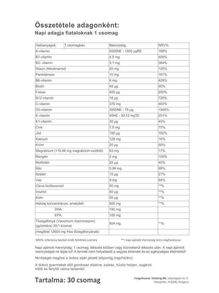 A modern életvitel, az iskolai követelmények, a sport, valamint a közösségi élet rengeteg energiát igényel. A napi multivitamin csomag gondosan válogatott összetevői hozzájárulnak a normál energiatermelő anyagcsere-folyamatokhoz, az idegrendszer megfelelő működéséhez, valamint a csontok és az izmok egészségéhez.