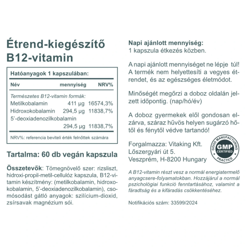 B-12 vitamin természetben előforduló összetevőkkel. Termékünk 411 µg metilkobalamint 294,5 µg hidroxokobalamint és 294,5 µg 5’-deoxiadenozilkobalamint tartalmaz kapszulánként. (a B12 természetben előforduló formái) A B12 vitamin részt vesz a normál energiatermelő anyagcsere-folyamatokban, hozzájárul az idegrendszer normál működéséhez, a normál vörösvérsejt-képződéshez és az immunrendszer normál működéséhez.