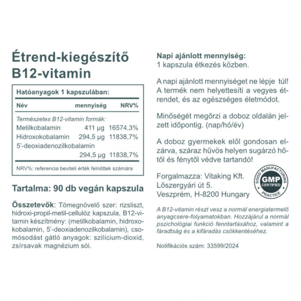 A Vitaking B12-vitamin (1000µg / kapszula) gazdaságos, 90 db-os kiszerelésben kapható.
