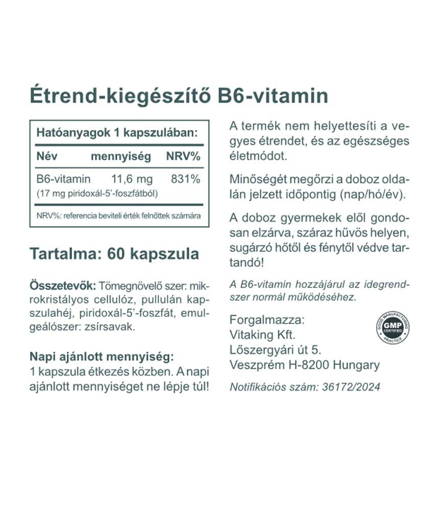 A készítmény kapszulánként 11,6 mg B6-vitamint tartalmaz (17 mg piridoxál-5’-foszfátból) így segíti a szervezet optimális támogatását a stresszes vagy megterhelő időszakokban.