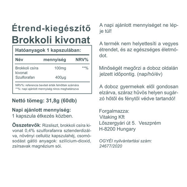 Akár a nyers csírát fogyasztja valaki minden nap, akár a főtt brokkolit, akár a kivonatot kapszulában, a hangsúly a mindennapos fogyasztáson van, amennyiben valamilyen speciális okból kifolyólag fogyasztjuk és nem az íze kedvéért. Tehát egészséges, de sajnos nem épp a legkedveltebb zöldségek egyike. Szulforafán a brokkolin kívül a karfiolban és a káposztában – és más káposztafélékben – is található, de legnagyobb mennyiségben a friss brokkoliban fordul elő. Az lenne a legideálisabb, ha mindenki friss zöldség formájában jutna hozzá ehhez a fontos tápanyaghoz. De ha ezt nem tudja megtenni, nagyszerű megoldást jelent a brokkolikivonat kapszula. A Vitaking koncentrált brokkolicsíra kivonat 100mg 400mcg szulforafán tartalommal rendelkezik.