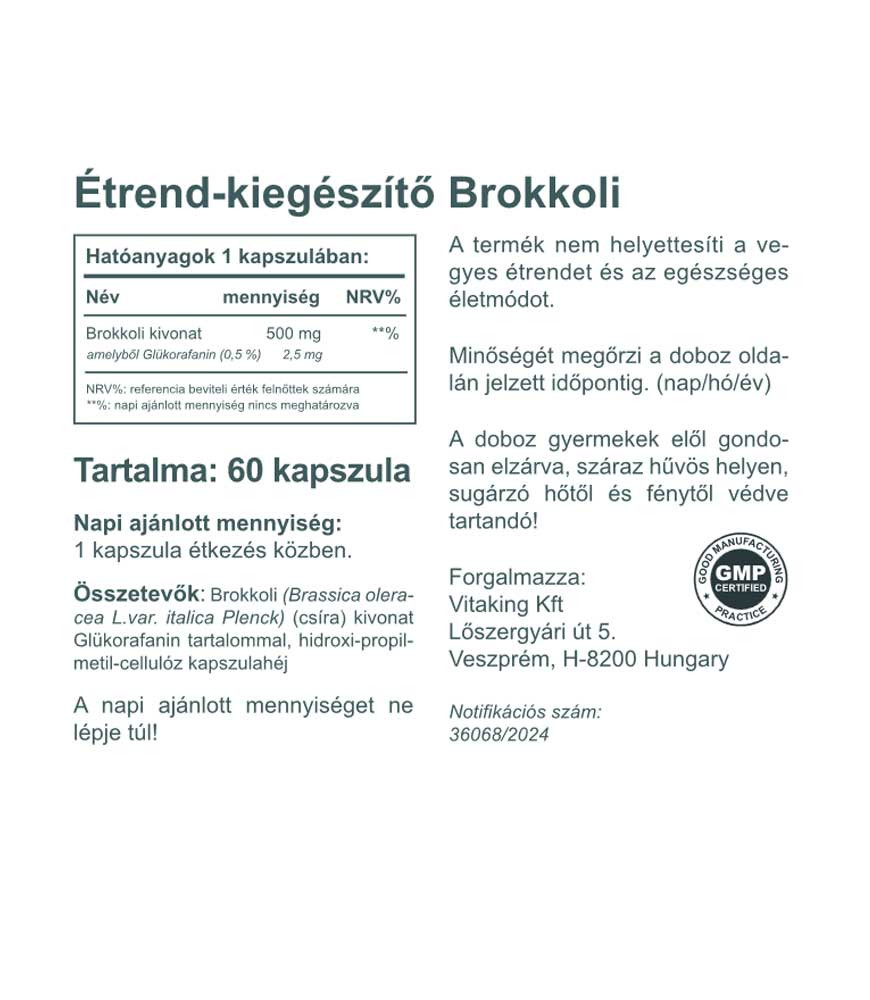 Összetevők: Brokkoli kivonat Glükorafanin tartalommal, hidroxi-propil-metil-cellulóz kapszulahéj