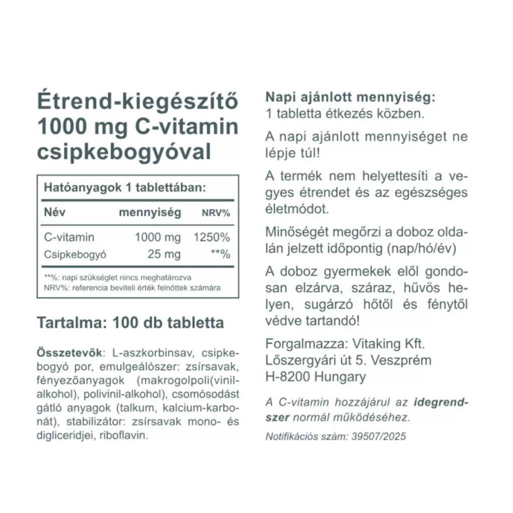 A C-vitamin egyike a leggyakrabban szedett vitaminoknak. Számtalan feladata van a szervezetünkben és kortól, nemtől és évszaktól függetlenül mindig szükség van rá, ráadásul vízoldékony vitamin, ezért fontos a rendszeres pótlása. A Vitaking 1000 mg-os C-vitamin termék plusz hozzáadott csipkebogyóval van kiegészítve. A csipkebogyó a természetben előforduló legjobb C-vitamin forrás. C-vitamint szedni ma már alap. Ez a Vitaking 1000 mg-os C-vitamin az átlagnál több csipkebogyót tartalmaz, tablettánként 25 mg található benne ebből az értékes tápanyagból. Remek összeállítás, kiváló ár/érték arány. A C-vitaminnak számtalan feladata van a szervezetben, és kortól, nemtől függetlenül mindenkinek szüksége van rá.