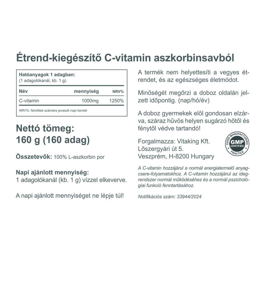 A Vitaking Aszkorbinsav 160g-os kiszerelésben, por formában tartalmazza a C-vitamint. Semmilyen adalékanyagot nem tartalmaz, csak tisztán ezt az értékes hatóanyagot. Nagy kiszerelésének köszönhetően igazán gazdaságos forma, jó ár-érték aránnyal bíró termék.