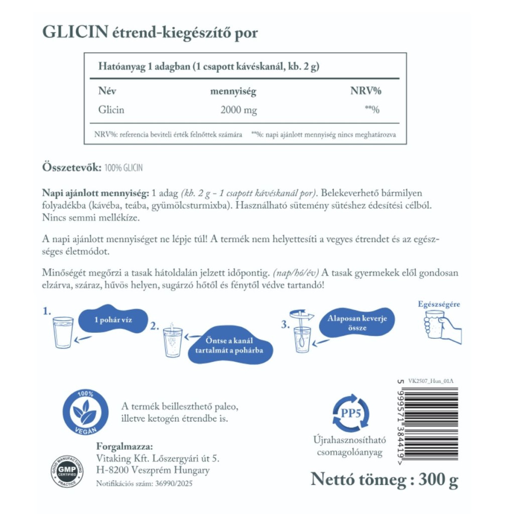 A Vitaking vegán glicin kiegészítő mentes minden mesterséges adaléktól, színezéktől és ízesítőtől, miközben új, környezetbarát csomagolásával a fenntarthatóságot is támogatja. Ha megbízható, tiszta glicinre vágysz, amely könnyen beépíthető a napi rutinba, ez a 300 grammos kiszerelés remek választás lehet számodra.