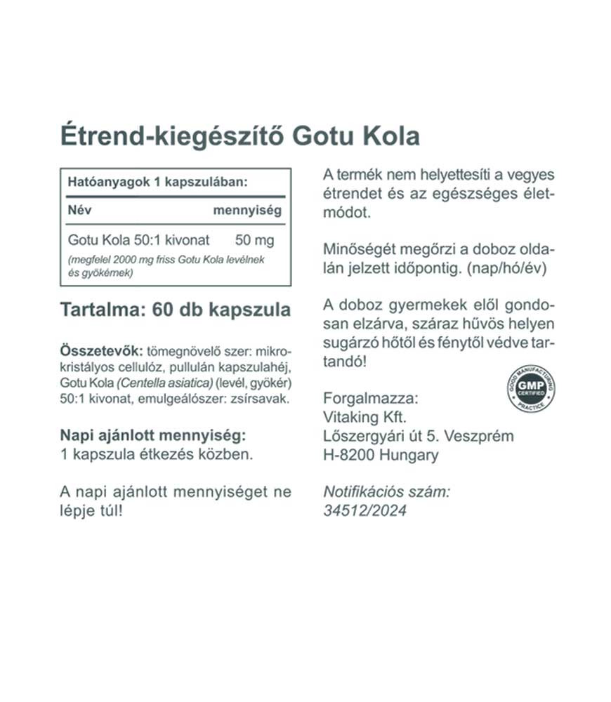 Összetevők: Tömegnövelő szer: mikrokristályos cellulóz, pullalán kapszulahéj, Gotu Kola (Centella asiatica) (gyökér) 50:1 kivonat, emulgeálószer: zsírsavak