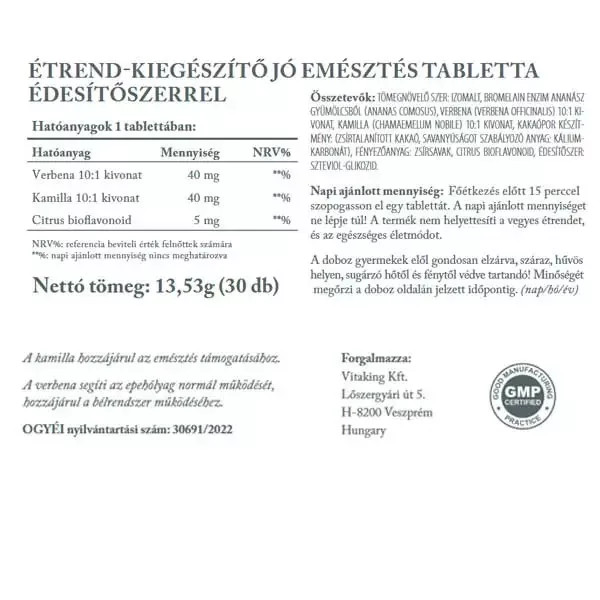 A Vitaking Jó emésztés gyógynövény komplex tabletta egy különleges, komplex készítmény. Verbena kivonatot, kamilla kivonatot, citrus bioflavonoidokat, és bromelain enzimet (ananász gyümölcsből) tartalmaz.