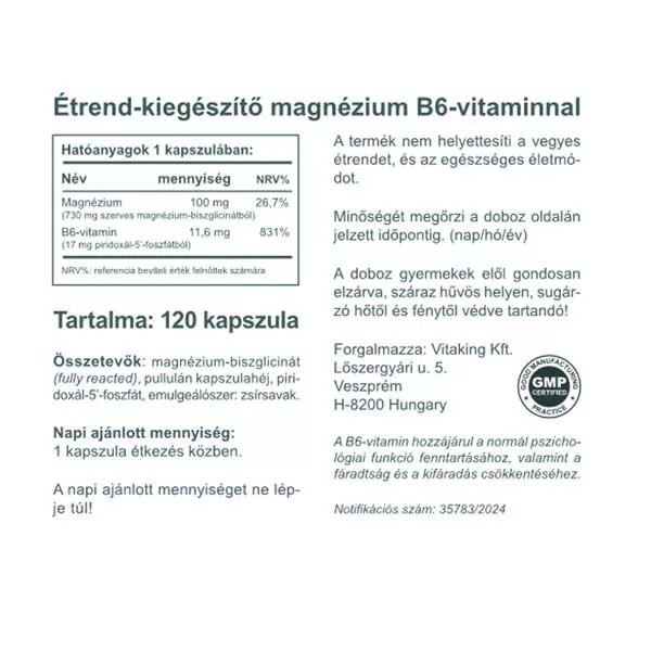 A Vitaking Szerves Magnézium biszglicinát+ P5P kapszula olyan étrend-kiegészítő, amely a magnézium-biszglicinátot (fully reacted) és a B6-vitamin aktív formáját, a piridoxál-5′-foszfátot (P5P) tartalmazza.