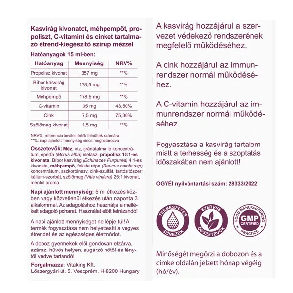 Napi adagja (15ml) 357mg Propolisz kivonatot, 178,5mg kasvirág kivonatot, 178,5mg méhpempőt, 35mg C-vitamint, 7,5mg cinket és 1,5mg szőlőmag kivonatot tartalmaz.