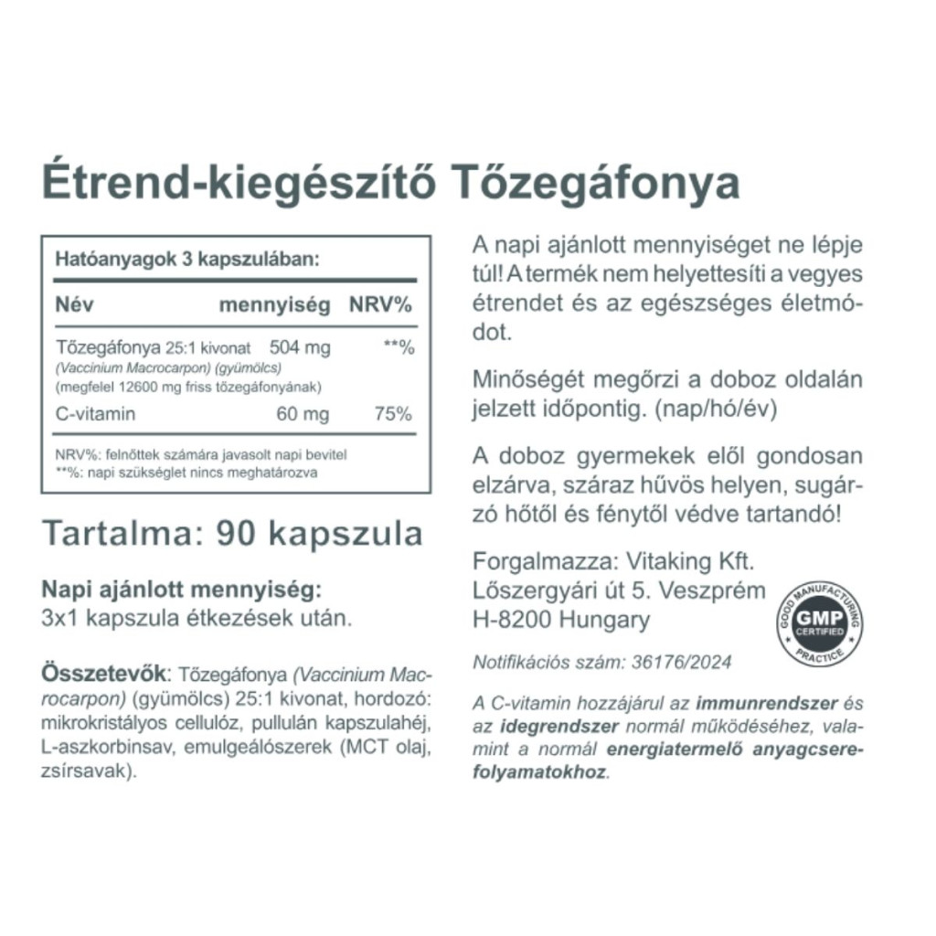 A Vitaking Tőzegáfonya kivonat praktikus, koncentrált megoldás mindazok számára, akik a mindennapok során természetes eredetű, bogyós gyümölcs-alapú kiegészítést keresnek. A C-vitamin tartalom révén pedig a napi immunrendszer-támogatásról is egyszerre gondoskodhatunk – egyszerűen, növényi kapszulában.