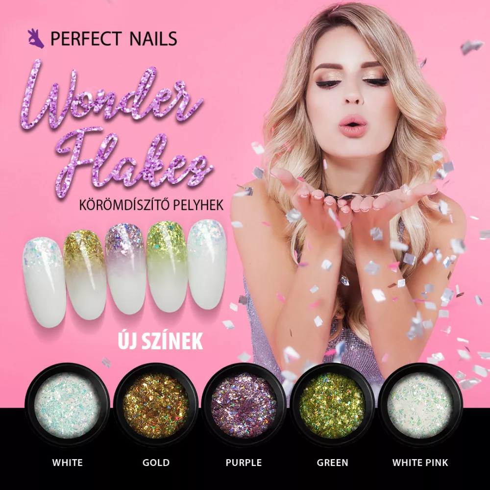 - Beépítve: Keverjük a Wonder Flakes körömdíszítő pelyhet clear zselébe vagy porcelánba, alakítsuk ki a teljes körmöt vagy használjuk csak francia véghez. Ha szükséges fedjük még egy réteg anyaggal.